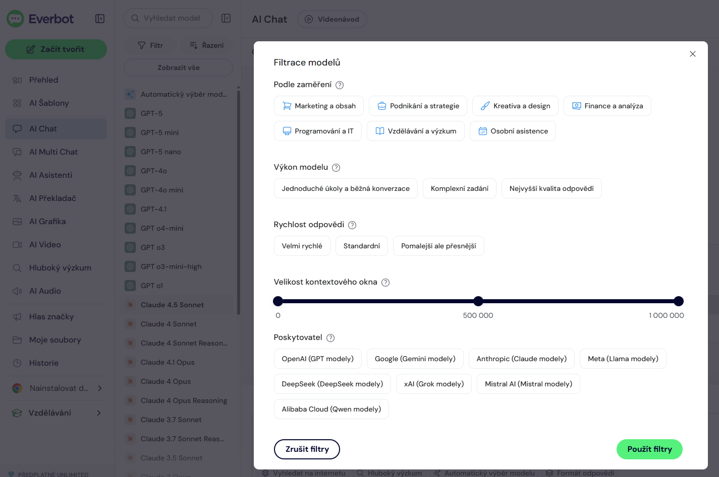 Tento systém je navíc plně v češtině a přehledně vizuálně zpracovaný, takže se v něm snadno zorientují i ti, kdo s umělou inteligencí teprve začínají. Everbot tím potvrzuje, že komfort uživatele je stejně důležitý jako výkon samotných modelů.