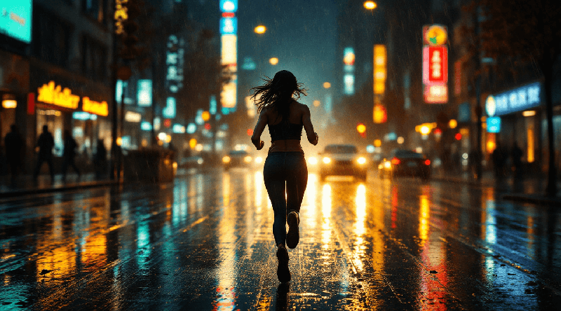 „Žena běží deštivou ulicí v noci, kamera ji sleduje zezadu, na mokrém asfaltu se odráží světla, filmové nasvícení.“